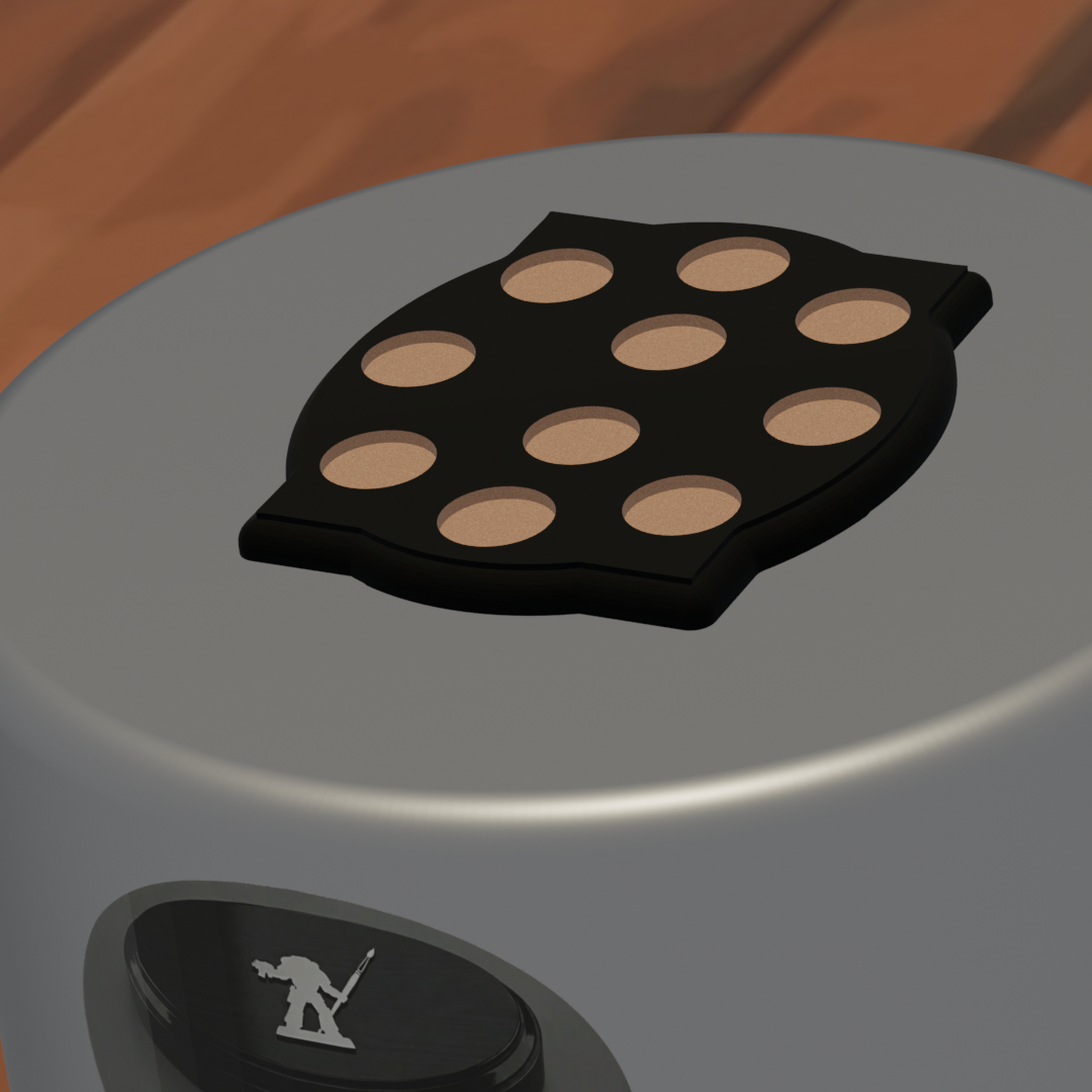 Display plinth featuring 10 round slots at 32.5 mm diameter and one 40.5 mm slot, accommodating infantry squads with an attached character model.