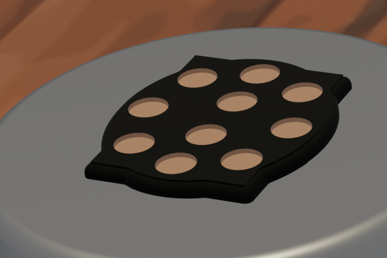 Display plinth featuring 10 round slots at 40.5 mm diameter and two 25.5 mm slot, accommodating teleport homer.