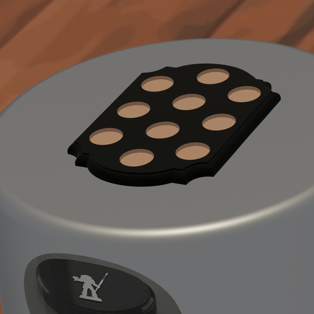Display plinth featuring 10 round slots at 32.5 mm diameter and one 40.5 mm slot, accommodating infantry squads with an attached character model.