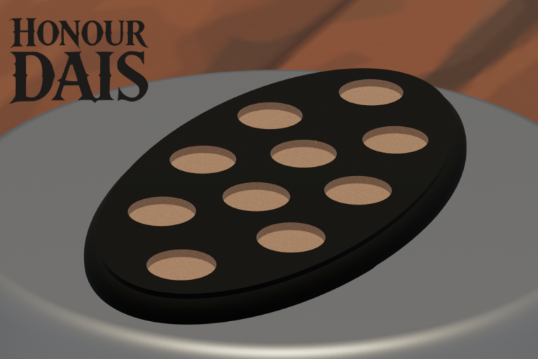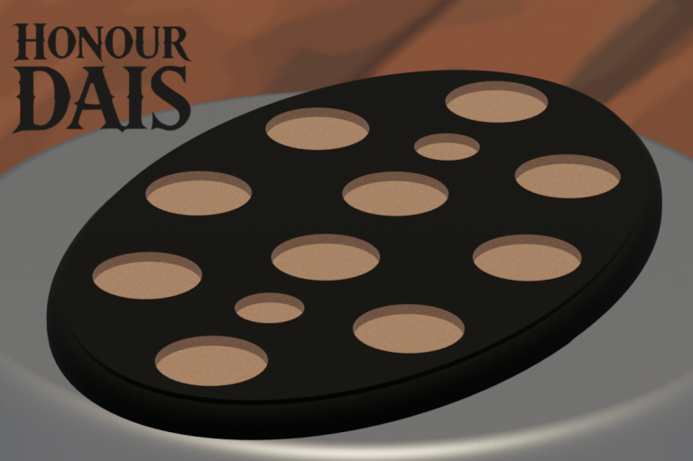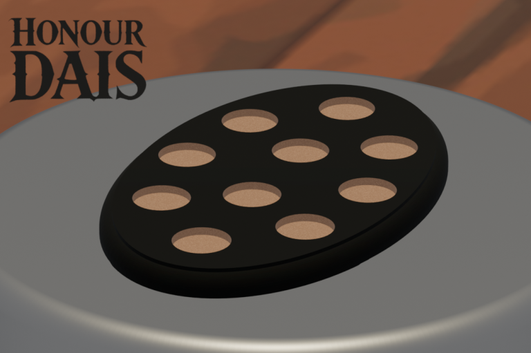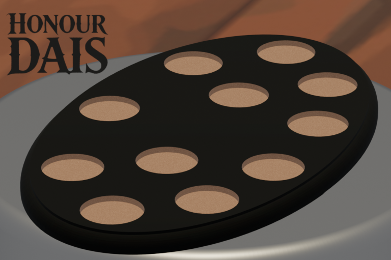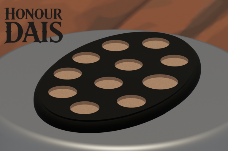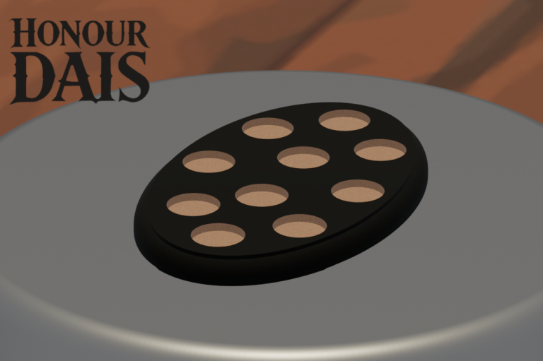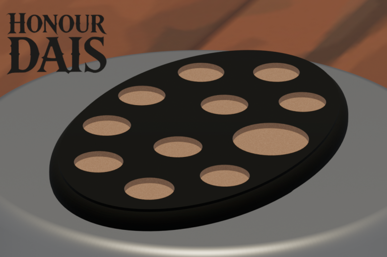 Display plinth featuring 10 round slots at 32.5 mm diameter and one 50.5 mm slot, accommodating infantry squads with an attached character model.