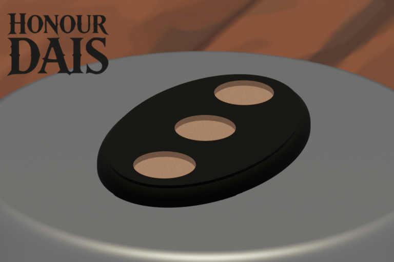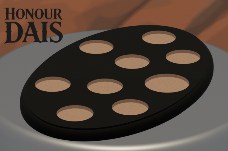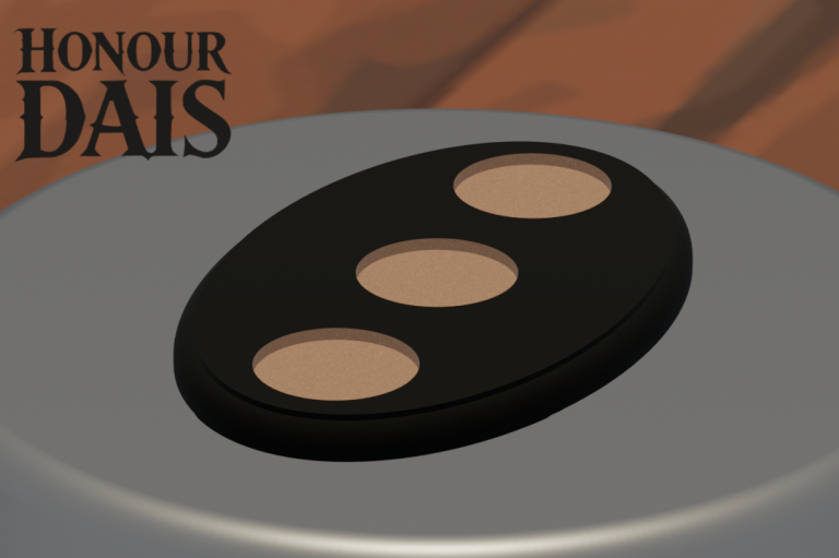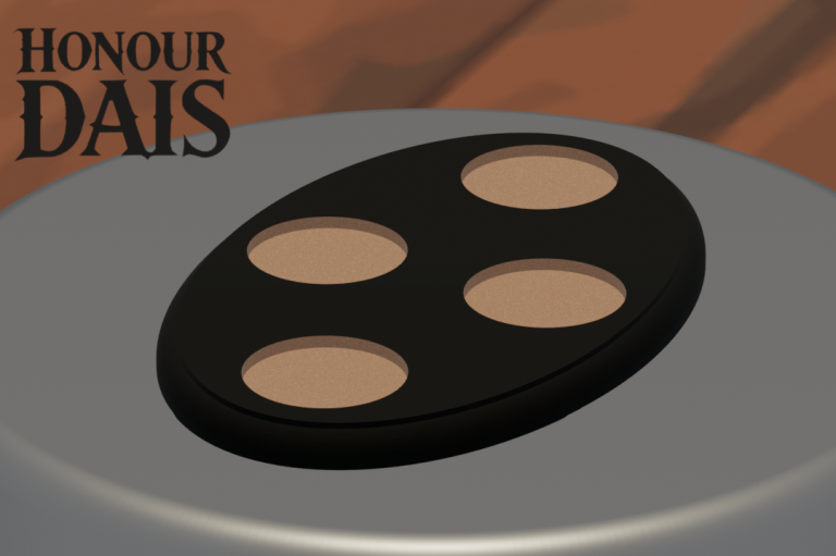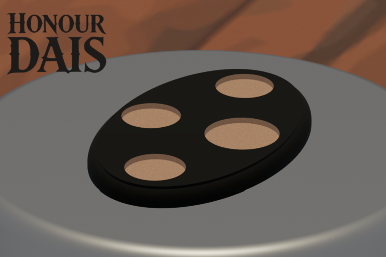 Display plinth featuring 3 round slots at 40.5 mm diameter and one 50.5 mm slot, accommodating infantry squads with an attached character model.