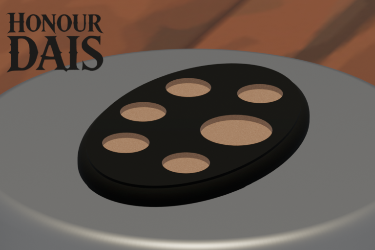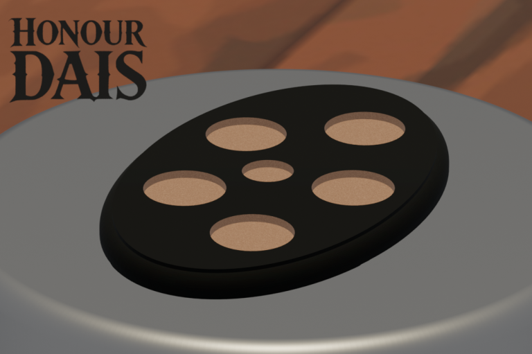 Display plinth featuring 5 round slots at 32.5 mm diameter and one 50.5 mm slot, accommodating infantry squads with an attached character model.