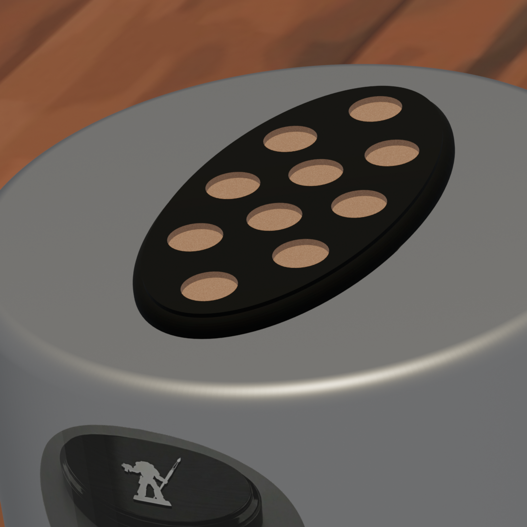 Display plinth featuring 10 round slots at 32.5 mm diameter and one 40.5 mm slot, accommodating infantry squads with an attached character model.