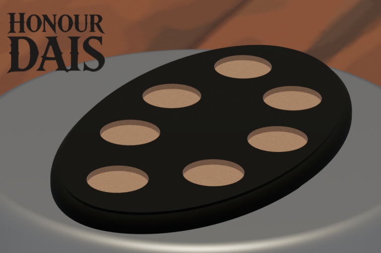 Display plinth featuring 6 round slots at 40.5 mm diameter and one 50.5 mm slot, accommodating infantry squads with an attached character model.