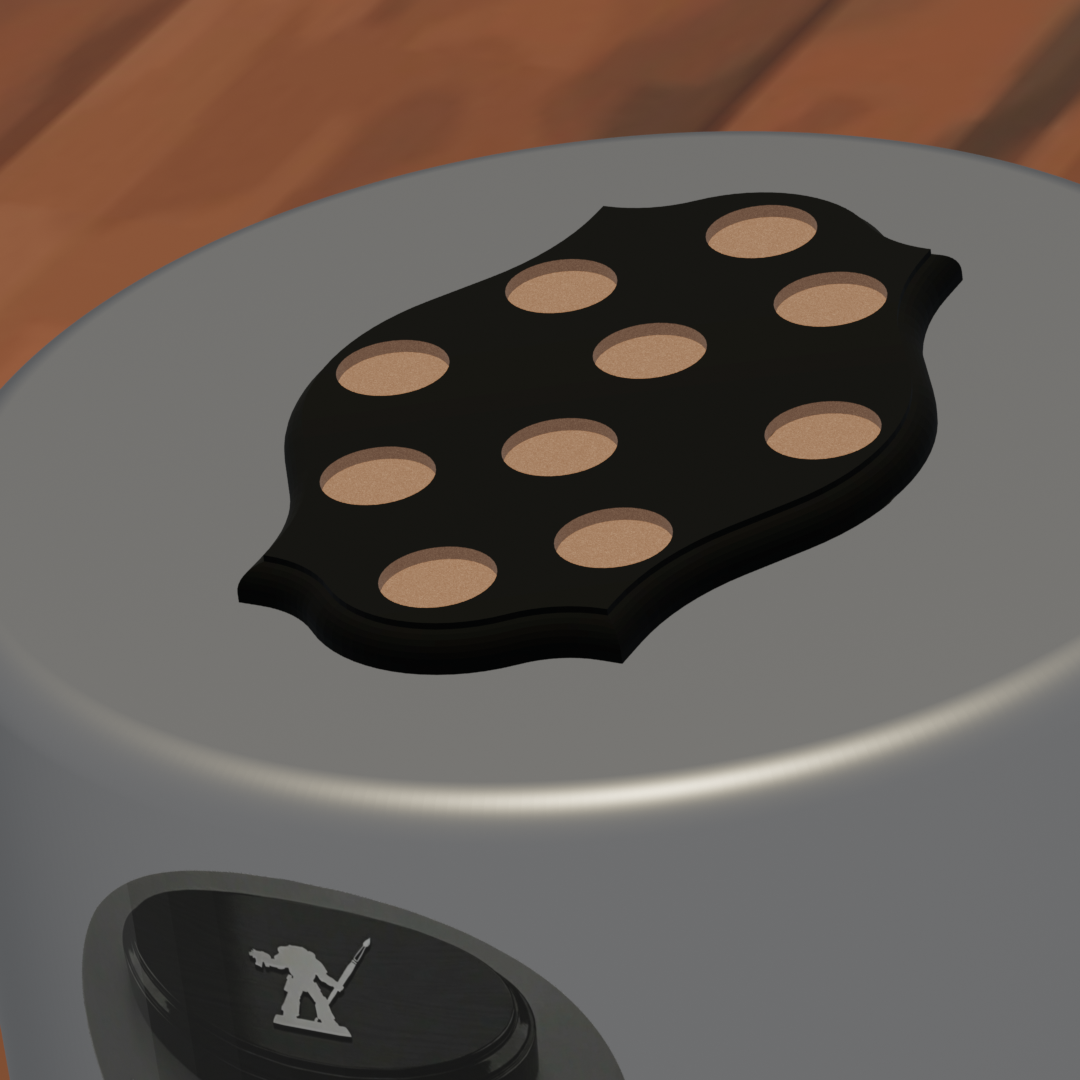 Display plinth featuring 10 round slots at 32.5 mm diameter and one 40.5 mm slot, accommodating infantry squads with an attached character model.